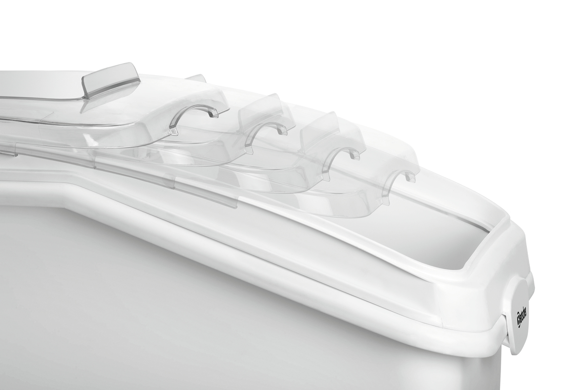 Boîte de stockage mobile et robuste pour le stockage hygiénique de différentes sortes de céréales, mais aussi d’épices, de riz ou de pâtes. Le couvercle transparent permet de voir rapidement quel aliment sec se trouve dans la boîte.
