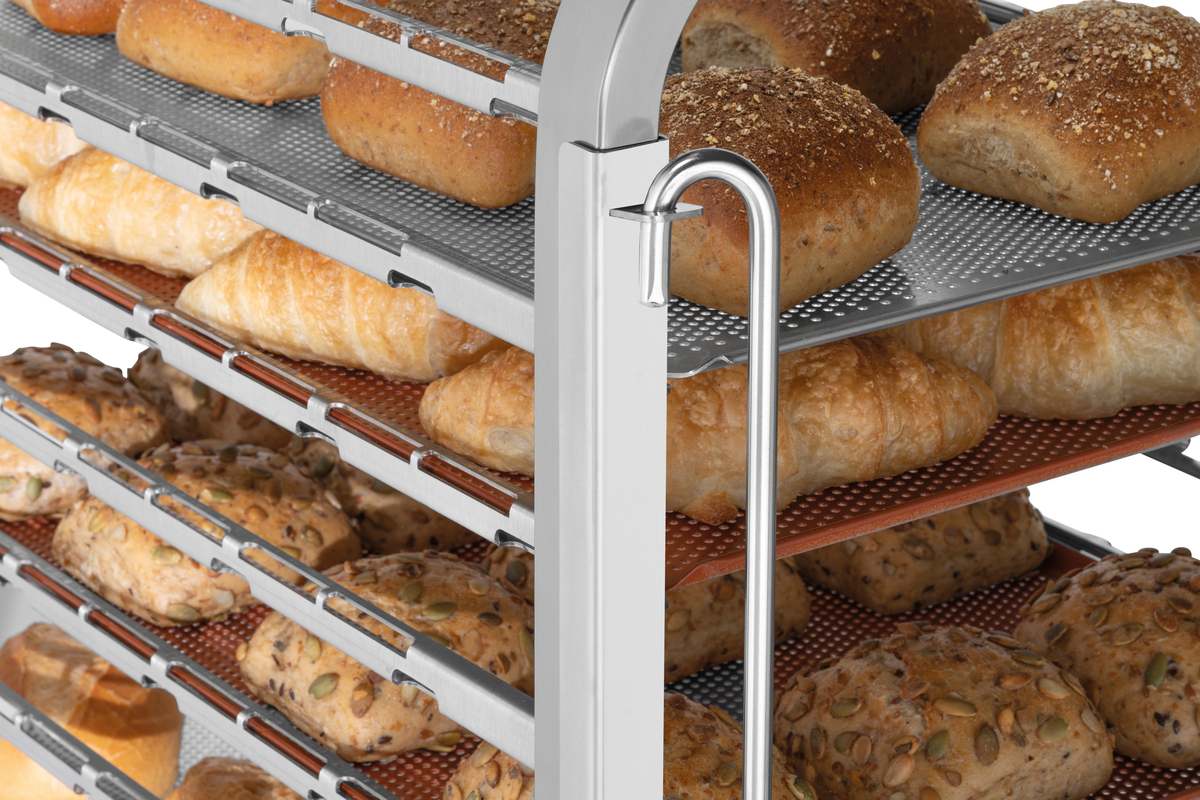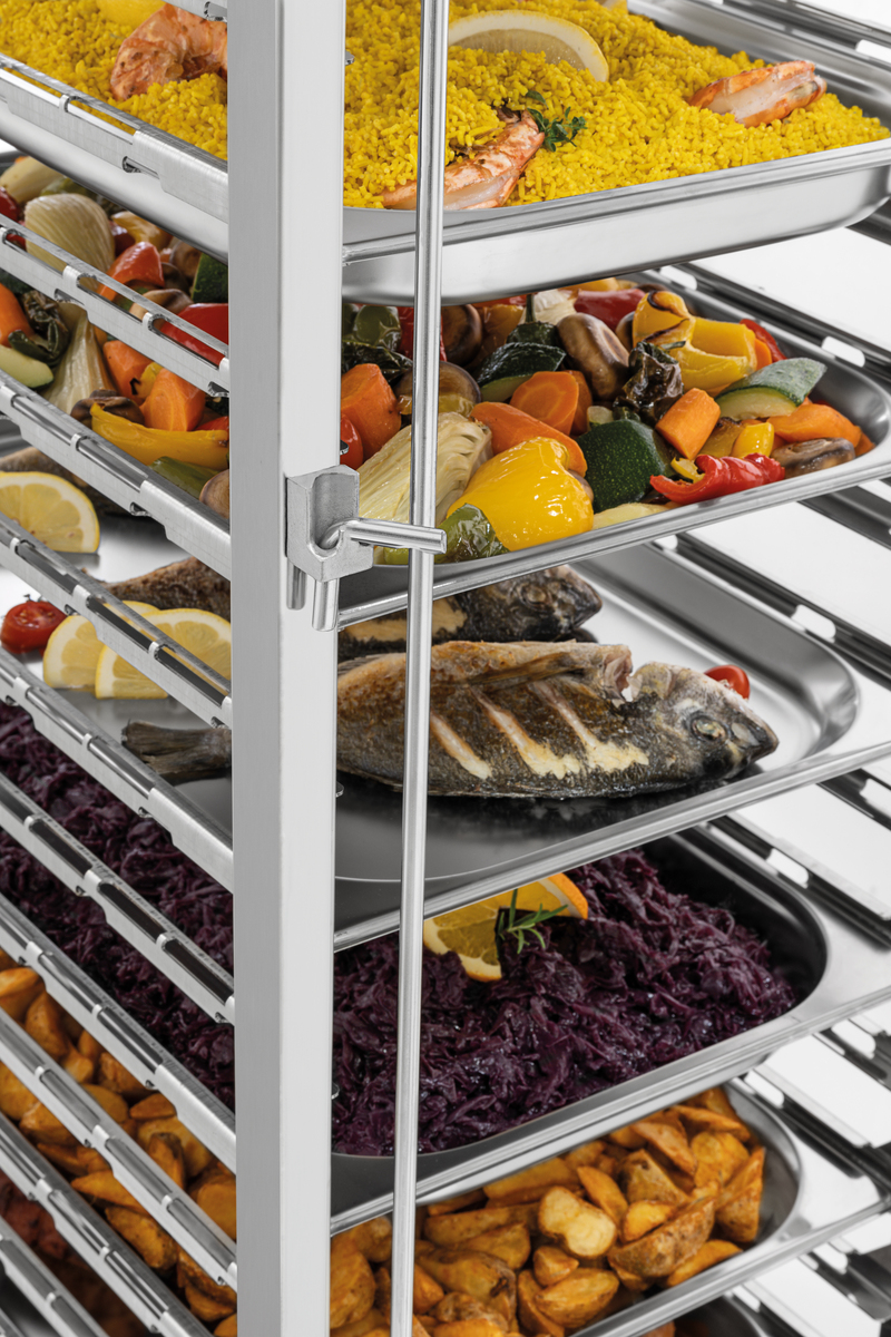 Pour un changement rapide : le chariot à claies est le complément parfait au four mixte Gigasteam 20110DRS, car quand le temps presse, chaque minute compte. Le chariot à claies peut être équipé de 20 récipients GN et être remplacé par le deuxième chariot à claies immédiatement après la fin de la cuisson.