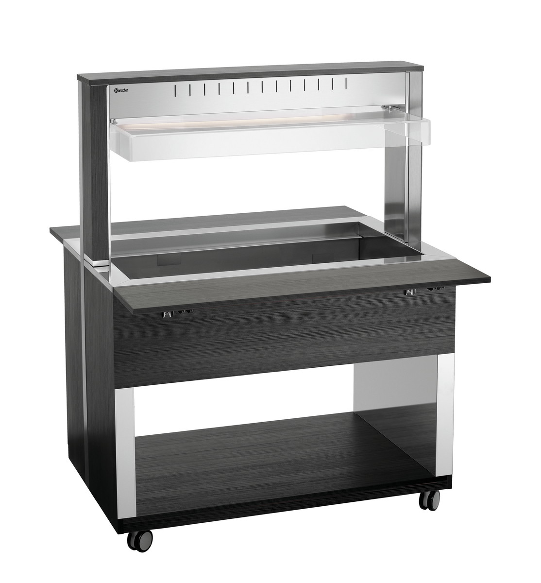 La solution de buffet mobile au design en bois moderne – le chariot de buffet avec protection contre les postillons et la toux et éclairage LED peut accueillir 3 récipients GN 1/1 GN et maintient les plats au chaud de manière douce et appétissante grâce au principe du bain-marie.