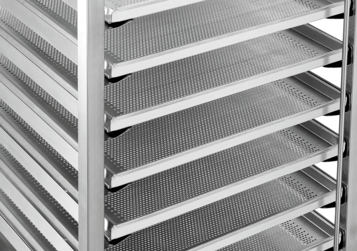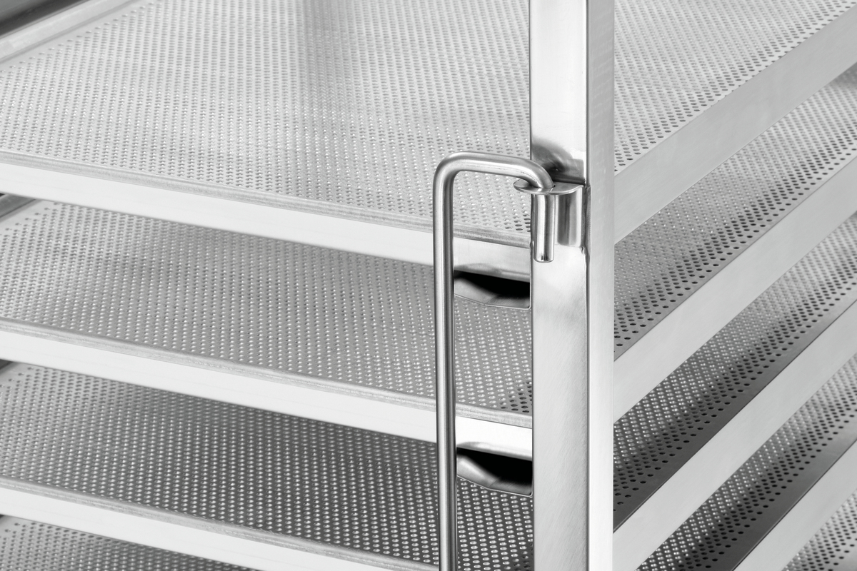 Le chariot de rangement pour les pâtisseries et les cuisines professionnelles peut accueillir 18 plaques de pâtisserie standard de 600 x 400 mm. La fixation des récipients des deux côtés permet un rangement rapide et sûr.