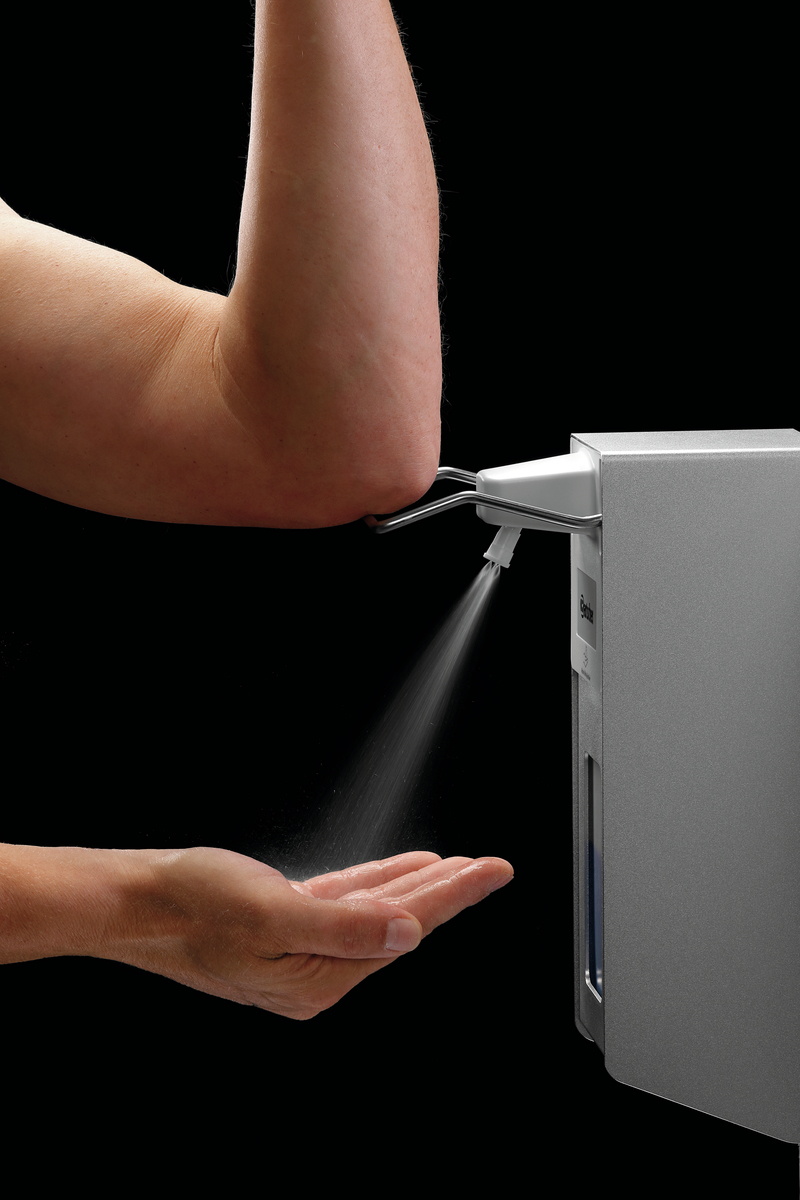 Distributeur de produit désinfectant équipé d’une commande avec le coude pratique pour des conditions d’hygiène optimales dans les bâtiments publics, les restaurants, les cuisines, les laboratoires, les écoles, etc. Le système de pompe sans cartouche assure un remplissage facile et écologique.