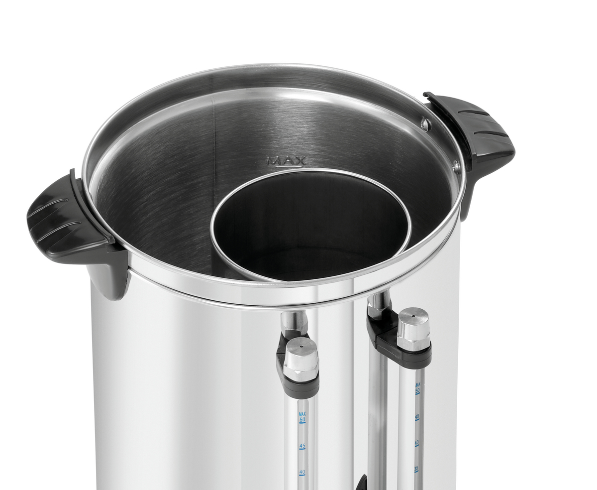 Le distributeur de thé et d’eau chaude d’une capacité totale de 8 litres maintient le thé et l’eau chaude à température pendant une longue période. Les deux indicateurs de niveau permettent de surveiller facilement la disponibilité.