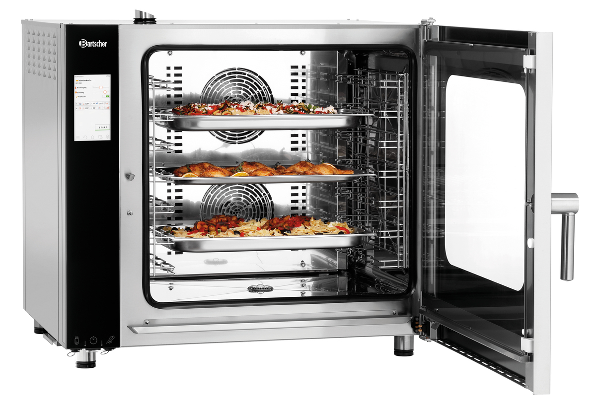 Le partenaire idéal dans toutes les cuisines : fours mixtes Bartscher avec 7 inserts au format 1/1 GN. Que ce soit avec ou sans sonde de température à coeur – la commande électronique permet un contrôle adapté aux besoins de tous les processus de cuisson. Avec la fonction Rack-Control, divers aliments peuvent être préparés à différentes heures. Heureusement que le Silversteam2 permet de garder un oeil sur tout.