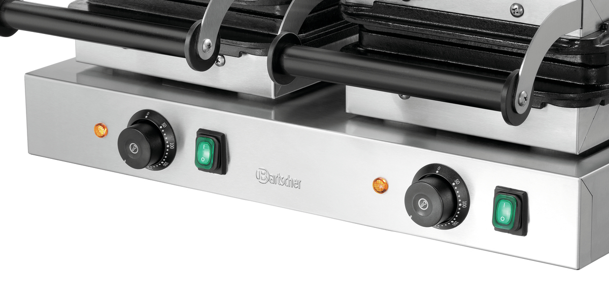 Le gaufrier avec 2 unités de cuisson en forme de gaufre de Bruxelles se distingue non seulement par la conductibilité élevée de la chaleur des plaques en fonte, mais aussi par sa structure robuste et par sa puissance. Les deux interrupteurs de marche/arrêt séparés permettent en outre une utilisation facile et adaptée aux besoins.