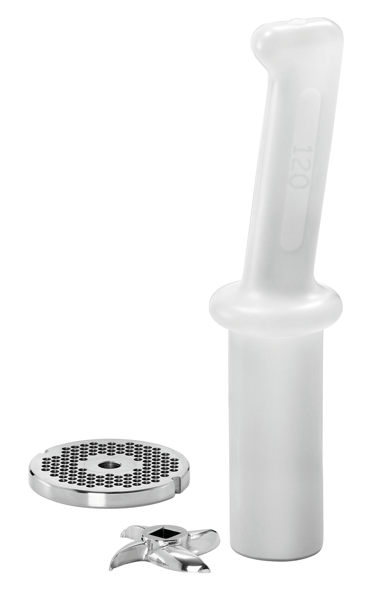 Hachoir à viande avec marche arrière – Pour la préparation de grandes quantités de viande jusqu’à 200 kg par heure. L’appareil puissant convainc également en combinaison avec la presse à hamburger FW200 disponible en option.