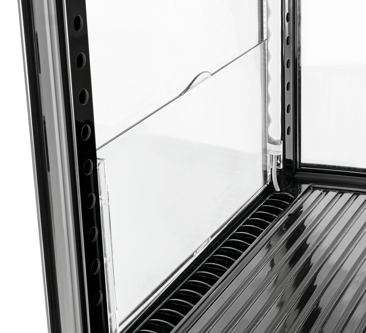 La mini vitrine réfrigérée à portes bombées à l’avant et à l’arrière est idéale pour les comptoirs. Grâce aux grilles à hauteur réglable, la vitrine réfrigérée noire offre un équipement flexible sur 4 niveaux avec une capacité de 75 Litres. Avec l’éclairage LED, les aliments refroidis sont présentés de façon optimale et parfaitement mis en valeur.