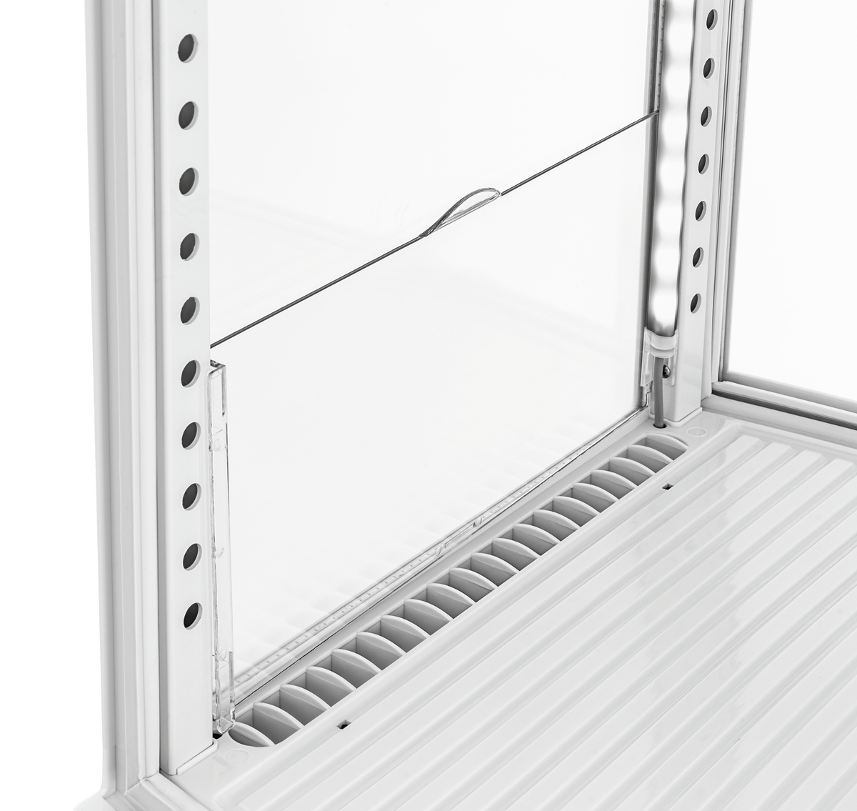 La mini vitrine réfrigérée à portes bombées à l’avant et à l’arrière est idéale pour les comptoirs. Grâce aux grilles à hauteur réglable, la vitrine réfrigérée blanche offre un équipement flexible sur 4 niveaux avec une capacité de 98 Litres. Avec l’éclairage LED, les aliments refroidis sont présentés de façon optimale et parfaitement mis en valeur.