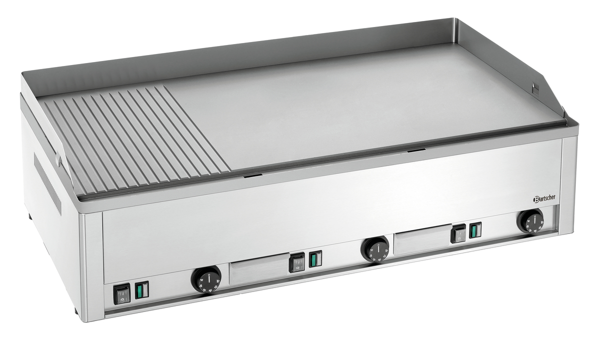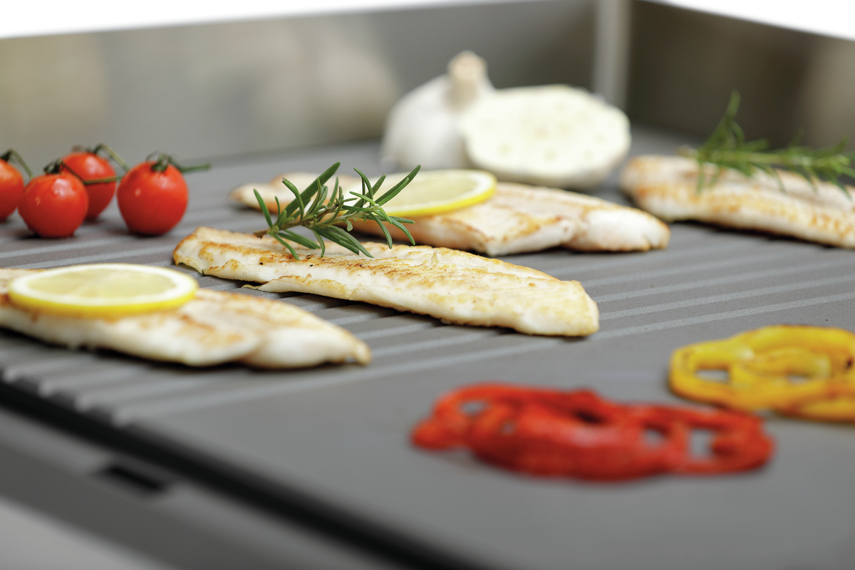 Une cuisson parfaite – avec ou sans traces de grillade. Sur une largeur de près d’un mètre, la plancha extra-large présente une surface lisse et une surface rainurée.