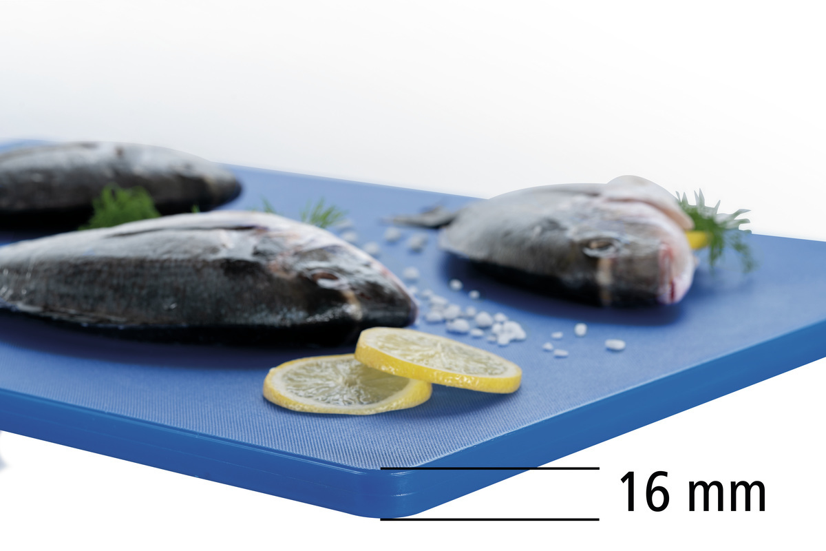 L’hygiène au coeur de l’attention avec les planches à découper dans un format de 60 x 40 cm – Planches à découper de différentes couleurs pour les différents groupes d’aliments. La planche à découper bleue conforme HACCP est conçue pour découper du poisson.