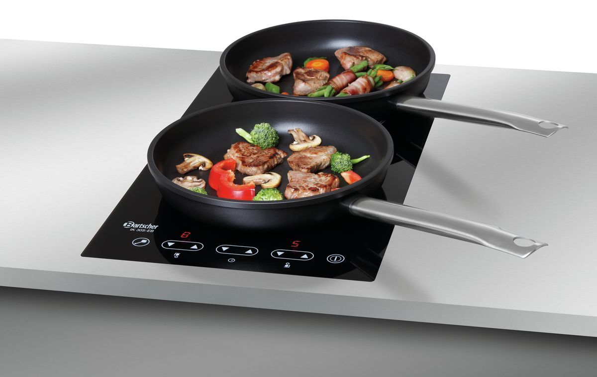 Plaque à induction compact et encastrable avec zones de cuisson côte à côte et une surface entièrement en vitrocéramique Schott.