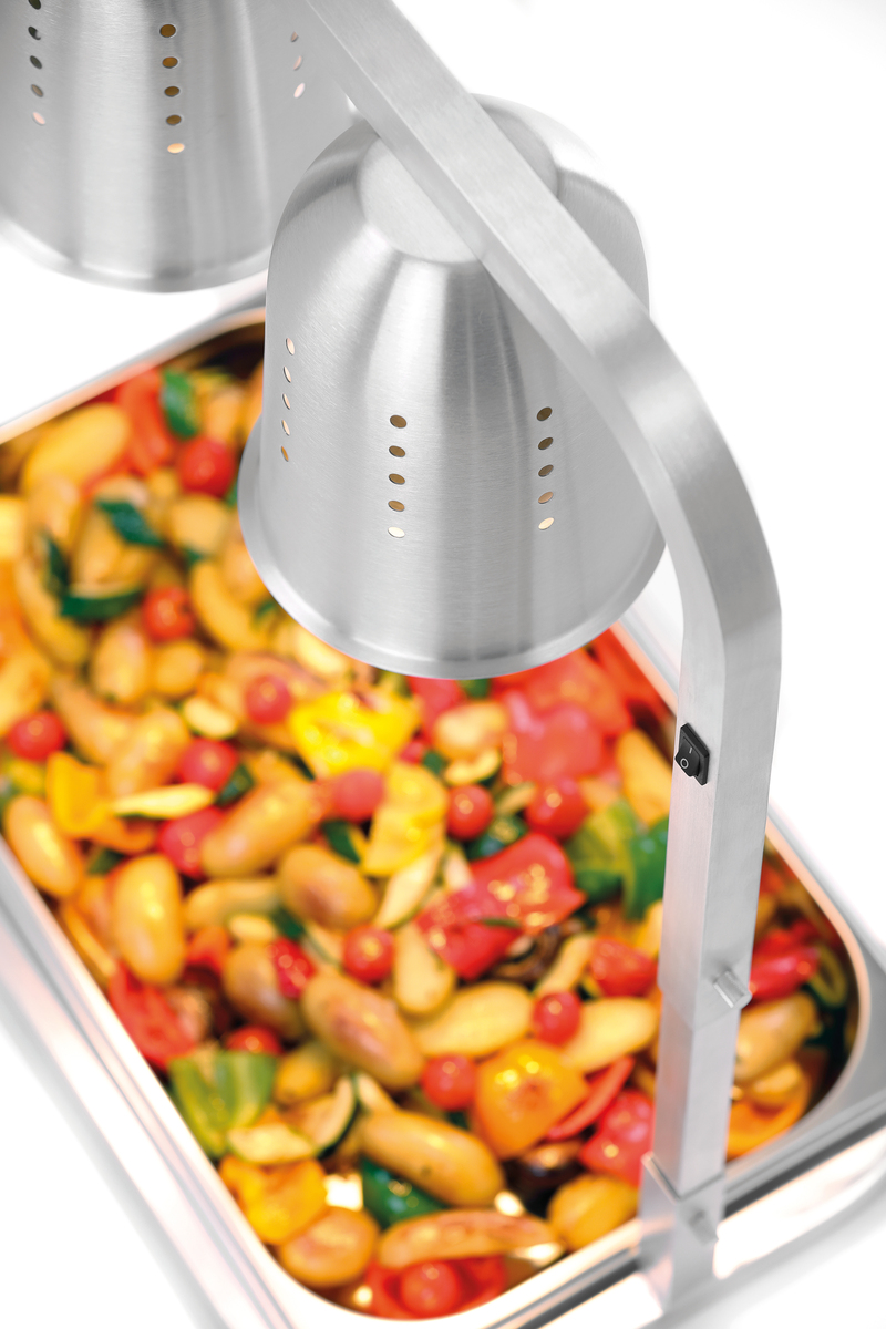 Que ce soit sur des buffets, dans le domaine du catering ou dans des cantines – les deux lampes chauffantes avec réflecteurs en aluminium ventilés assurent une diffusion de chaleur ciblée. Cela permet de garder au chaud les plats dans des récipients d’une taille pouvant aller jusqu’à 1/1 GN.
