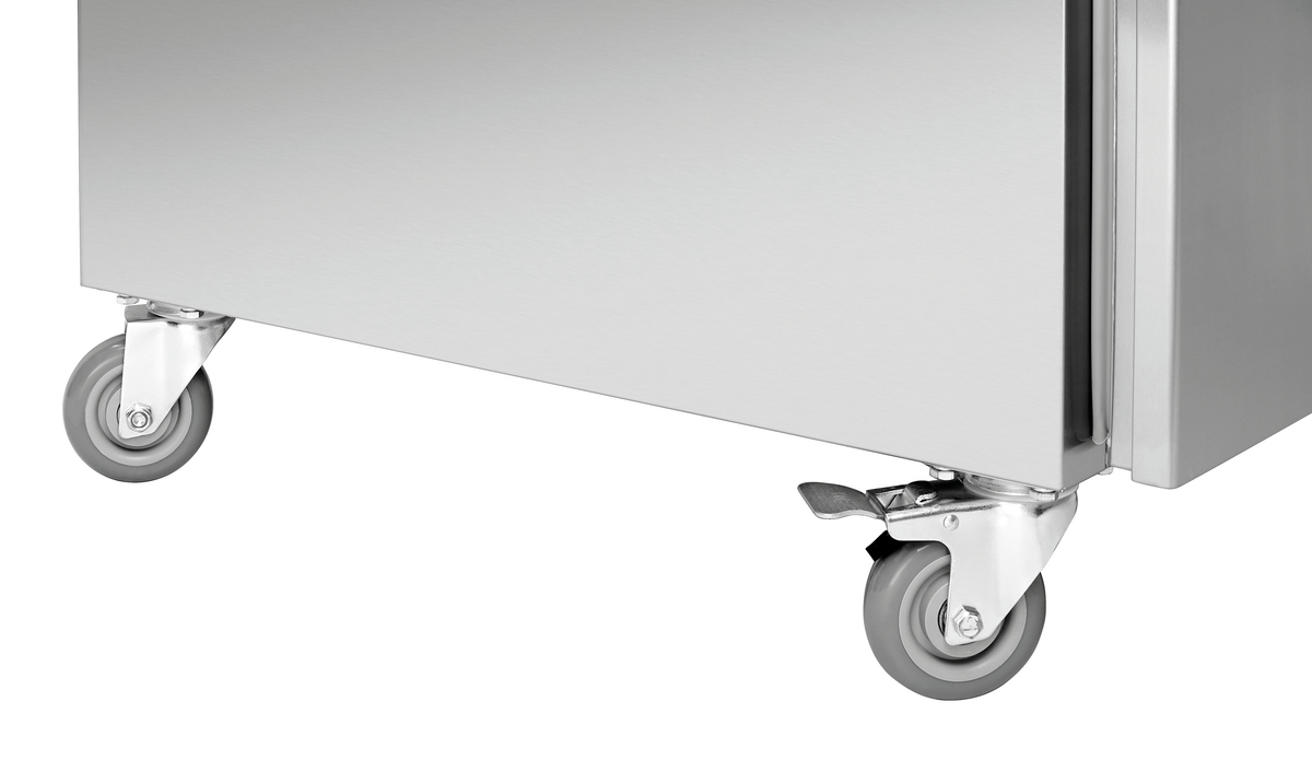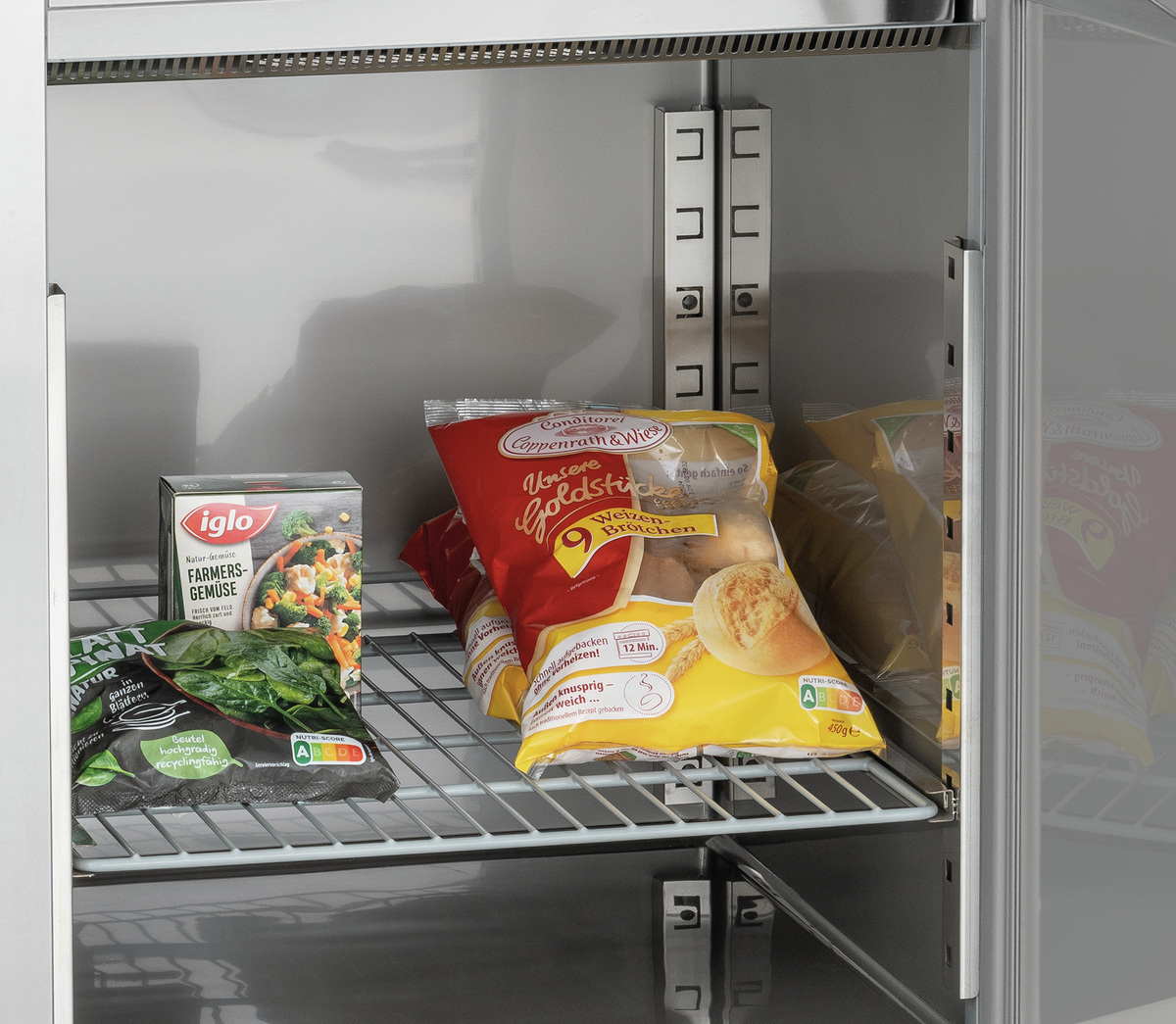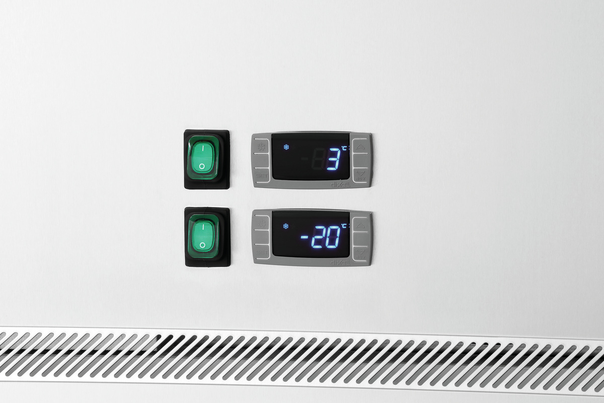 Cet appareil combiné associe un réfrigérateur et un congélateur et offre ainsi un accès rapide aux aliments réfrigérés et congelés avec un encombrement minimal. Les glissières compatibles avec le format GN peuvent être utilisées avec les grilles fournies ou avec des récipients GN.