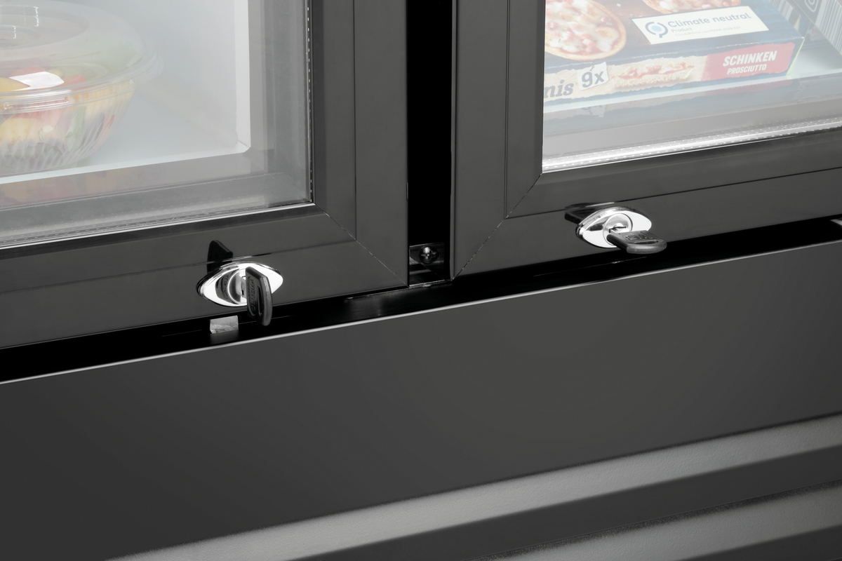 Réfrigérateur et congélateur combiné dans un design noir esthétique avec une contenance de 820 litres. Les portes en verre permettent de voir directement les aliments qui sont mis en valeur par l’éclairage LED commutable séparément.