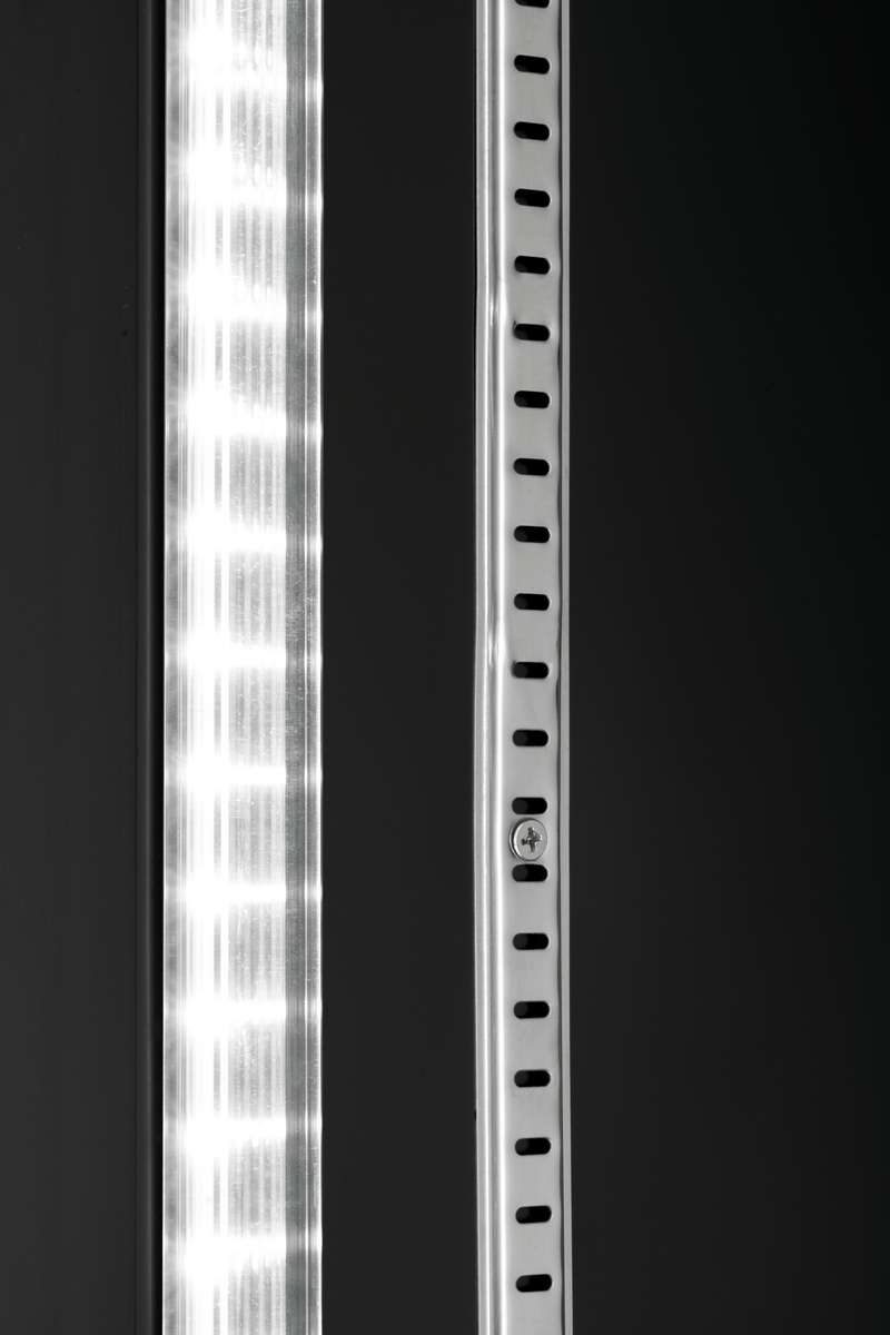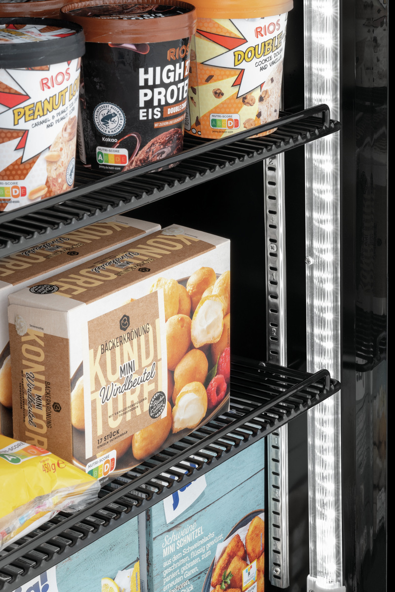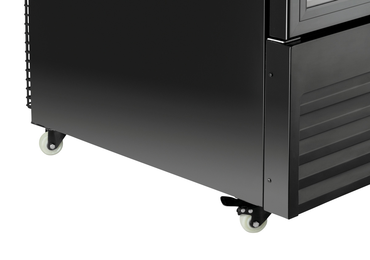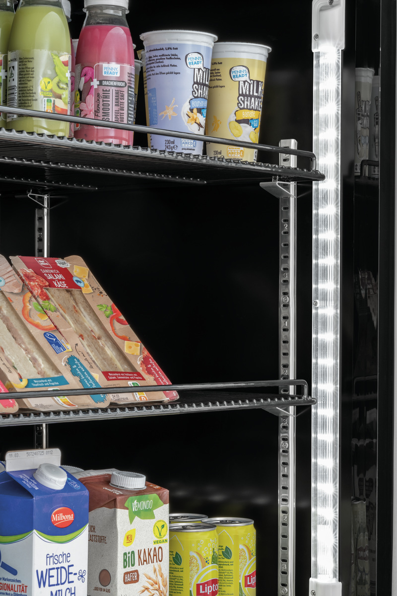 Combinaison entre un réfrigérateur et un congélateur dans un design entièrement noir élégant. Les portes en verre permettent de visualiser directement les aliments, qui peuvent être mis en valeur par l’éclairage LED à commutation séparée.
