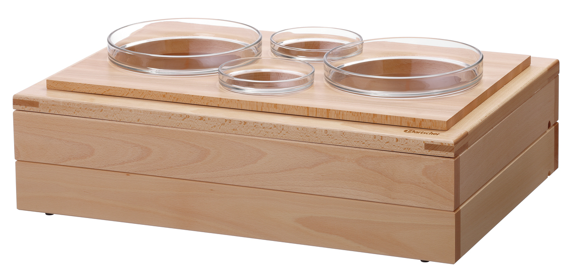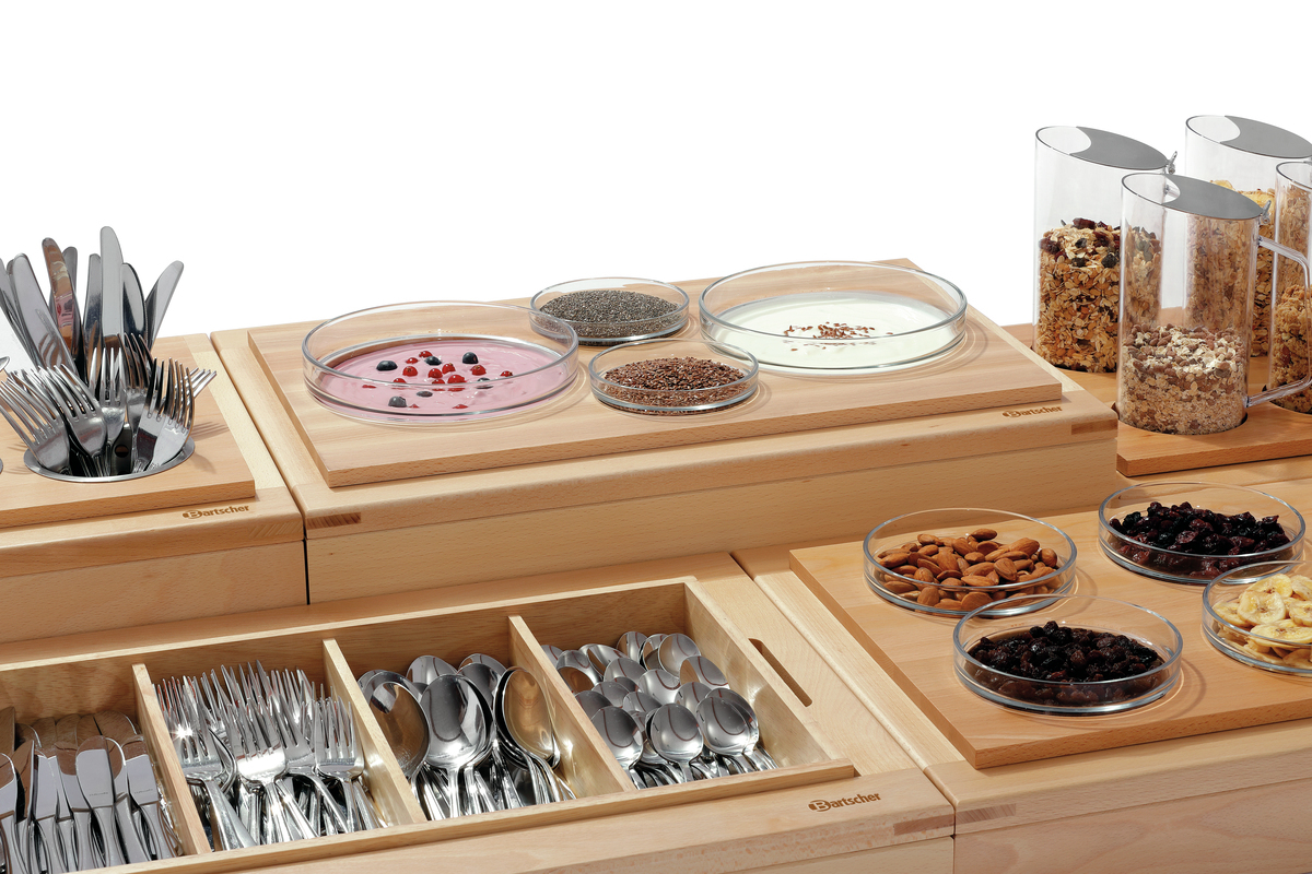 Ce set modulaire au design en bois sobre permet de bien structurer les buffets et de les rendre attrayants. Que ce soit pour le buffet du petit déjeuner, du déjeuner ou du soir, les 4 bols en verre peuvent par exemple être remplis de noix, de fruits secs, d’antipasti, de toppings ou de dressings et peuvent être facilement remplacés ou remplis.