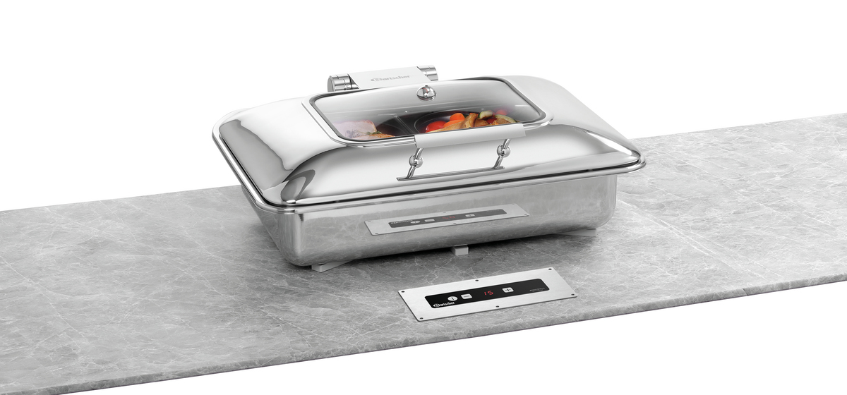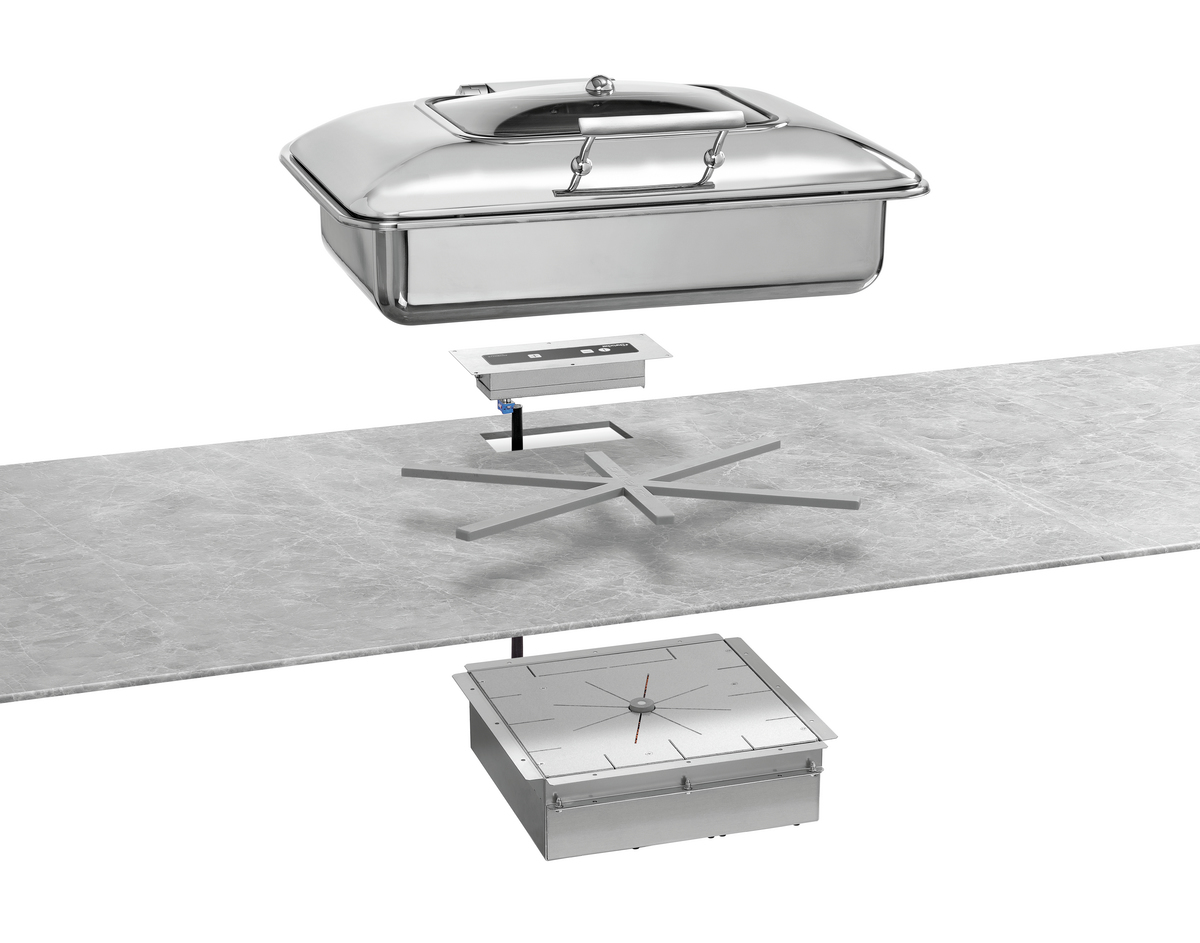Avec le système de maintien au chaud à induction « invisible », le plan de travail peut être utilisé au choix comme dispositif de maintien au chaud ou comme surface de travail. Monté sous un plan de travail, ce système surprenant permet de chauffer un Chafing Dish jusqu'à 100 °C alors que la température du plan de travail atteint 35 °C maximum.