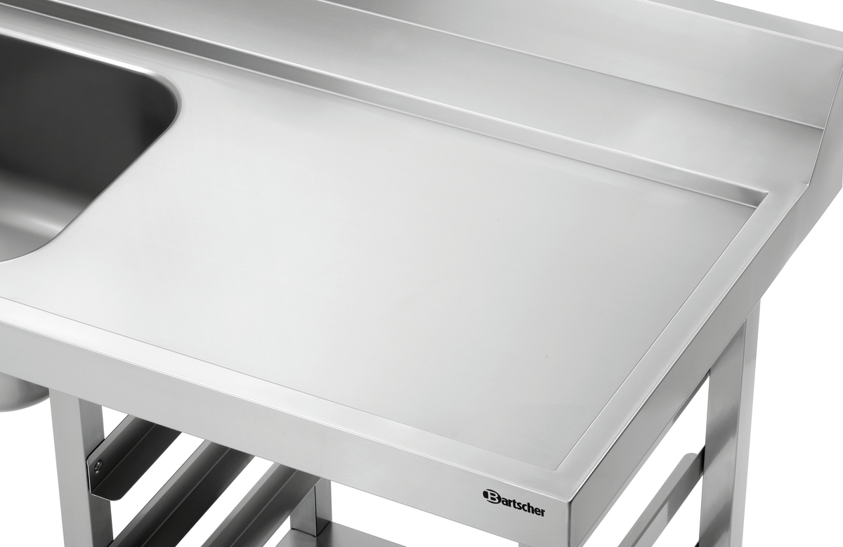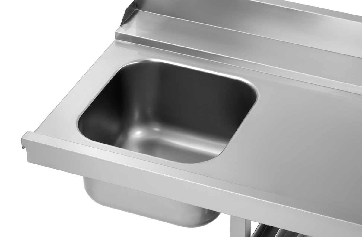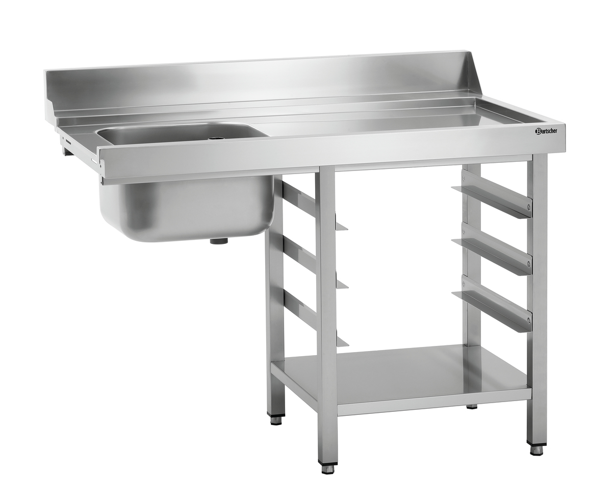 La table de tri avec évier de 40 litres est conçue pour être installée à droite d’un lave-vaisselle à convoyeur DS. Les 3 glissières pour paniers pratiques permettent de ranger des paniers de 500×500 et de 600×500 d’une hauteur allant jusqu’à 145 mm.