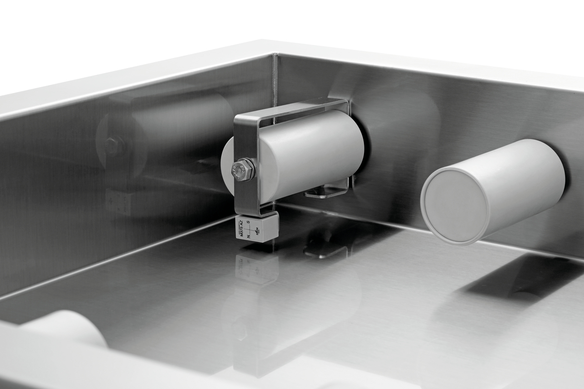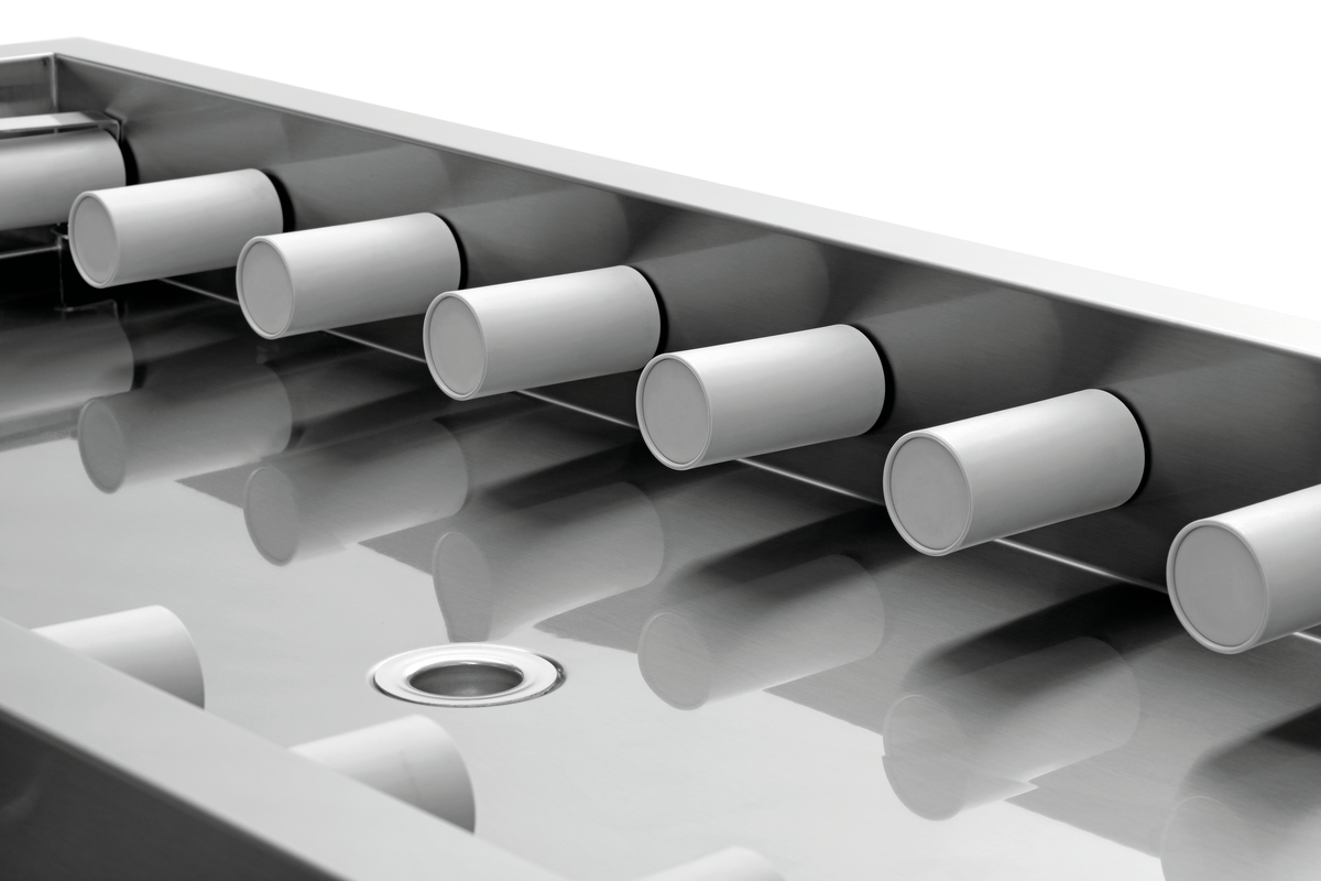 La table d’égouttage à rouleaux de convoyage est le complément parfait pour le lave-vaisselle à convoyage KTS5000. Les 20 rouleaux de convoyage assurent un fonctionnement parfait. Grâce au capteur intégré, la bande de convoyage du KTS5000 s’arrête automatiquement lorsque la table d’égouttage est pleine.