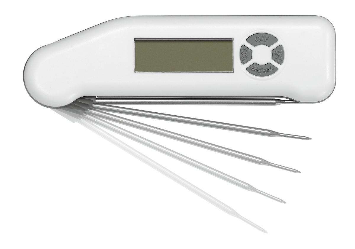 Thermomètre étanche avec sonde de température à coeur dépliable. La large plage de températures de -40 °C à +300 °C est tout aussi utile que l’écran éclairé et la mémoire mini./maxi..