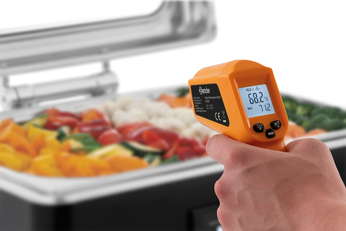 Le thermomètre infrarouge avec affichage numérique et pointeur laser intégré permet de contrôler facilement les températures de surface. Il est particulièrement adapté au contrôle de la chaîne du froid pour les produits frais et surgelés ainsi que pour une utilisation au buffet ou dans la distribution des repas.