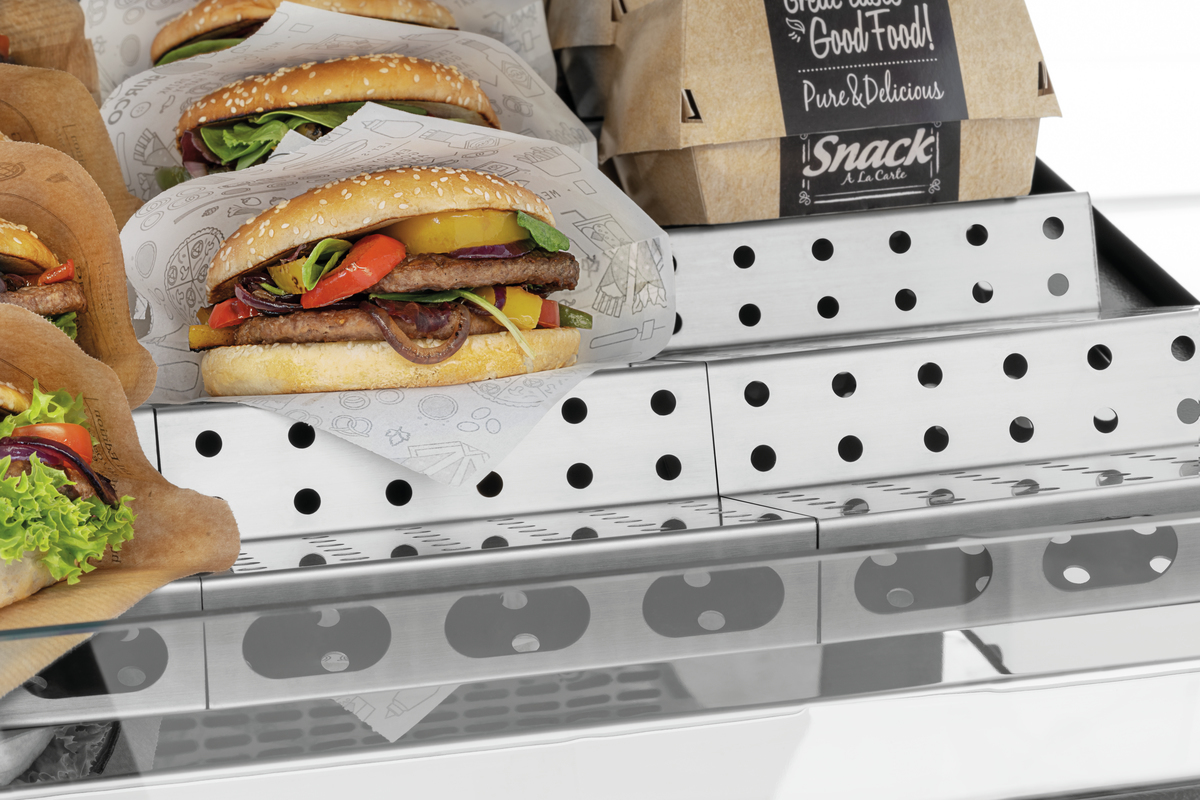 Le Gamechanger pour les heures de pointe au snack – avec la vitrine de maintien au chaud, les snacks préparés sont maintenus au chaud et peuvent être prélevés facilement. Grâce à l’éclairage LED, les snacks chauds sont mis en scène pour les clients de façon à promouvoir la vante.