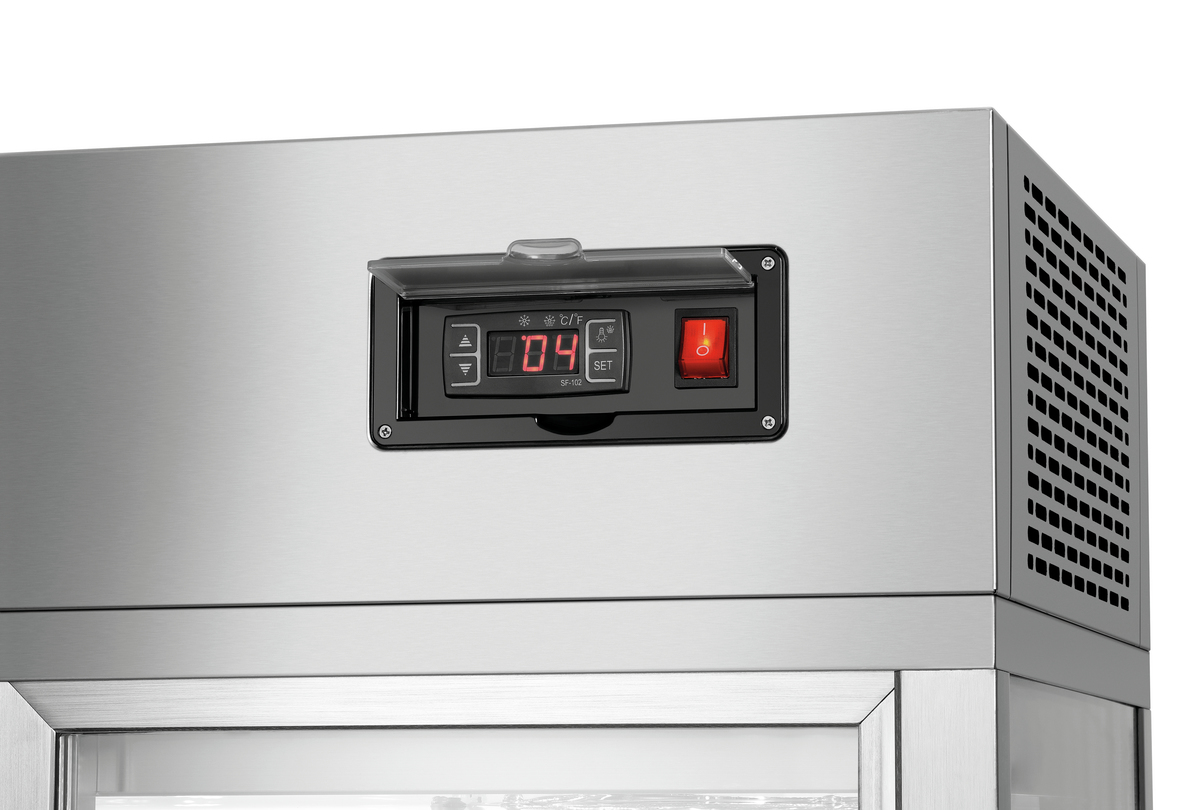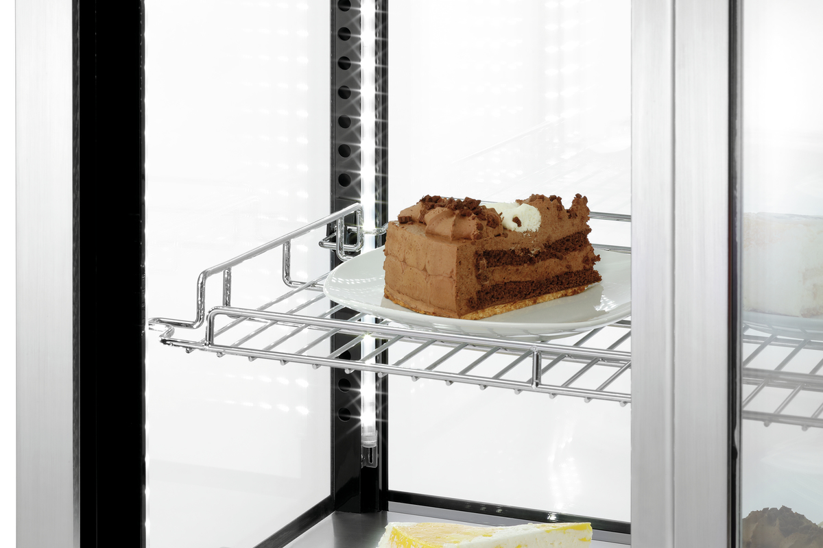 Vitrine sur table en verre et acier inoxydable de qualité supérieure pour la présentation de plats et de snacks dans les cantines, les épiceries, les bars ou les cafés. Les portes coulissantes en verre permettent une utilisation compacte et facile – l’éclairage LED assure une présentation parfaite.